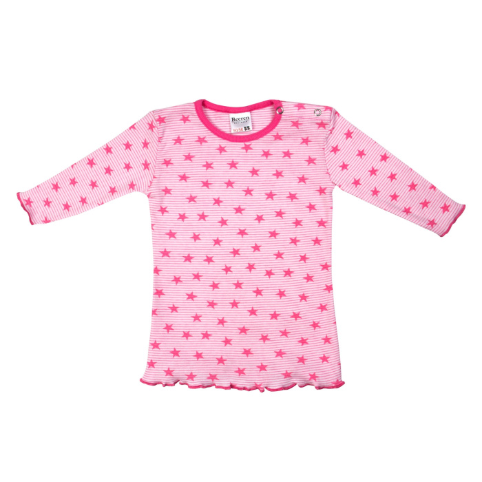 Meisjes nachthemd met lange mouw gemaakt, van een mooie zachte fijnrib met een leuke all-over print. De hals is afgezet met boord, de mouwen en de onderzijde zijn afgewerkt met een smal manchet.