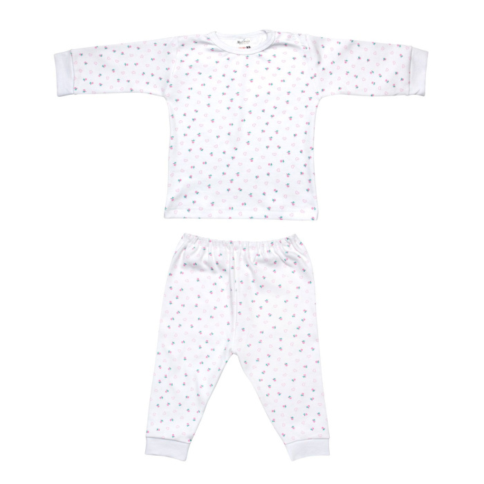 Mooie pyjama gemaakt van een mooie zachte fijnrib met een leuke all over print. De hals is afgezet met boord en de mouwen en pijpen met een elastische manchet.