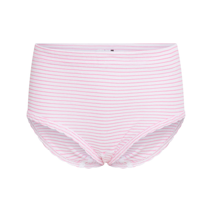 Slip zonder zijnaden gemaakt van een fijnrib met streepdessin. De pijpen zijn afgezet met een schulp boordje en de taille is omgezoomd met een tunnelelastiek.