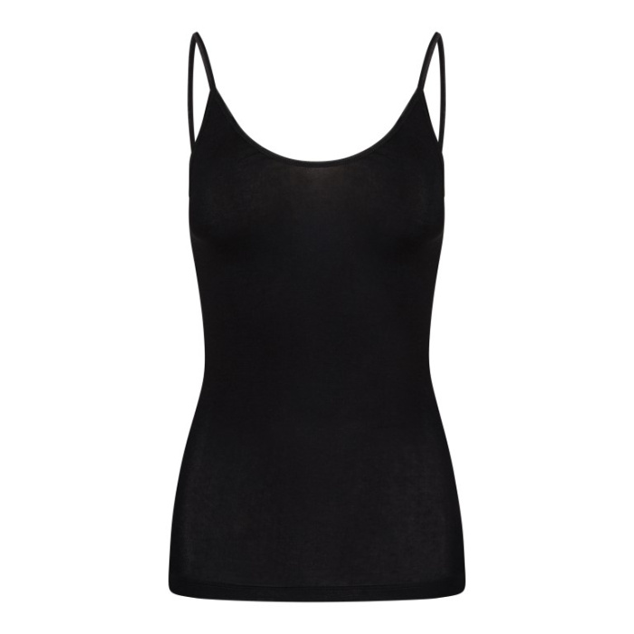 Dames spaghetti hemd gemaakt van een elastische single jersey, zonder zijnaden. De hals en armsgaten zijn afgewerkt met een elastisch satijnbandje.