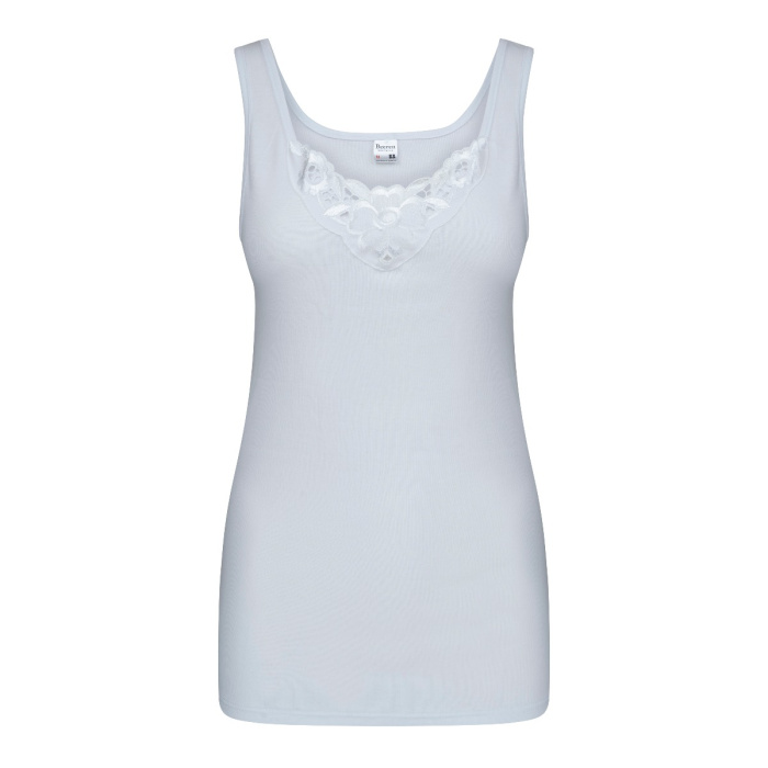 Dames hemd gemaakt van een fijnrib, zonder zijnaden. De hals en armsgaten zijn afgewerkt met een smal boordje. De hals is voorzien van een kanten inzetstuk. 100% katoen, 100% comfort. Dit artikel kan op 60ºC gewassen worden.