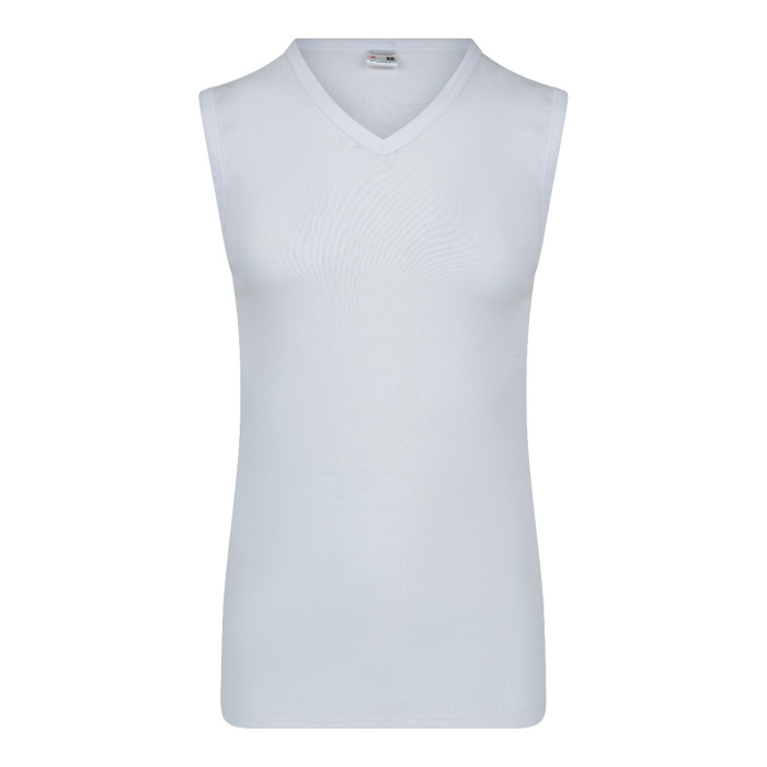 Heren mouwloos shirt met V-hals zonder zijnaden gemaakt van fijnrib. De hals & armsgaten zijn afgezet met boord. 100% katoen, 100% comfort. Dit artikel kan op 60ºC gewassen worden.