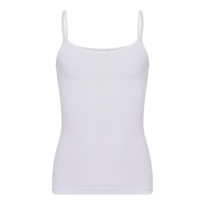 Elastisch getailleerd spaghetti hemdje, gemaakt van een zachte micro stof, zonder zijnaden. De hals en armsgaten zijn afgezet met een elastisch satijnbandje.