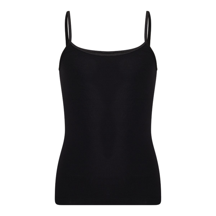 Elastisch getailleerd spaghetti hemdje, gemaakt van een zachte micro stof, zonder zijnaden. De hals en armsgaten zijn afgezet met een elastisch satijnbandje.
