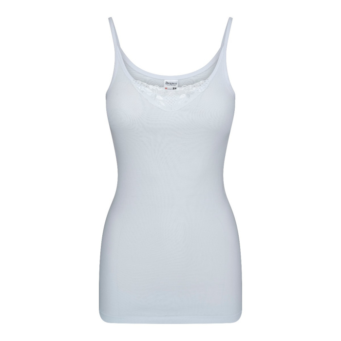 Dames hemd gemaakt van een fijnrib, zonder zijnaden. De hals en armsgaten zijn afgewerkt met een smal boordje. De hals is voorzien van een kanten inzetstuk. 100% katoen, 100% comfort. Dit artikel kan op 60ºC gewassen worden.