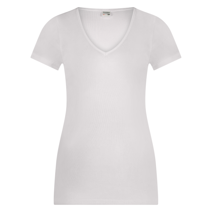 Dames T-shirt V-hals zonder zijnaden gemaakt van een fijnrib. De hals & armsgaten zijn afgezet met boord. 100% katoen, 100% comfort. Dit artikel kan op 60ºC gewassen worden.